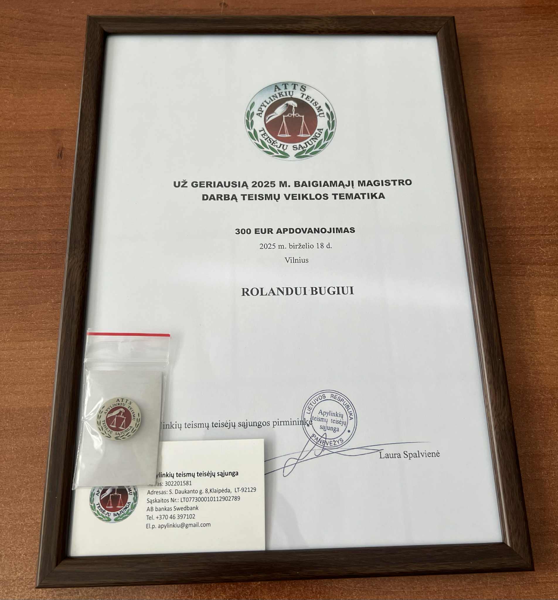 Šiandien Šv. Jonų bažnyčioje vykusioje iškilmingoje diplomų įteikimo ceremonijoje Vilniaus universiteto Teisės fakulteto absolventams, Apylinkių teismų teisėjų sąjunga pirmą kartą apdovanojo vieną iš jų, - Rolandą Bugį, už geriausią magistro darbą teismų veiklos tema. Jo darbas „Teisminės vykdymo proceso kontrolės įgyvendinimo ypatumai“ Vilniaus universiteto Teisės fakulteto ir Sąjungos Kandidatų į apdovanojimą vertinimo komisijos įvertintas kaip geriausias.